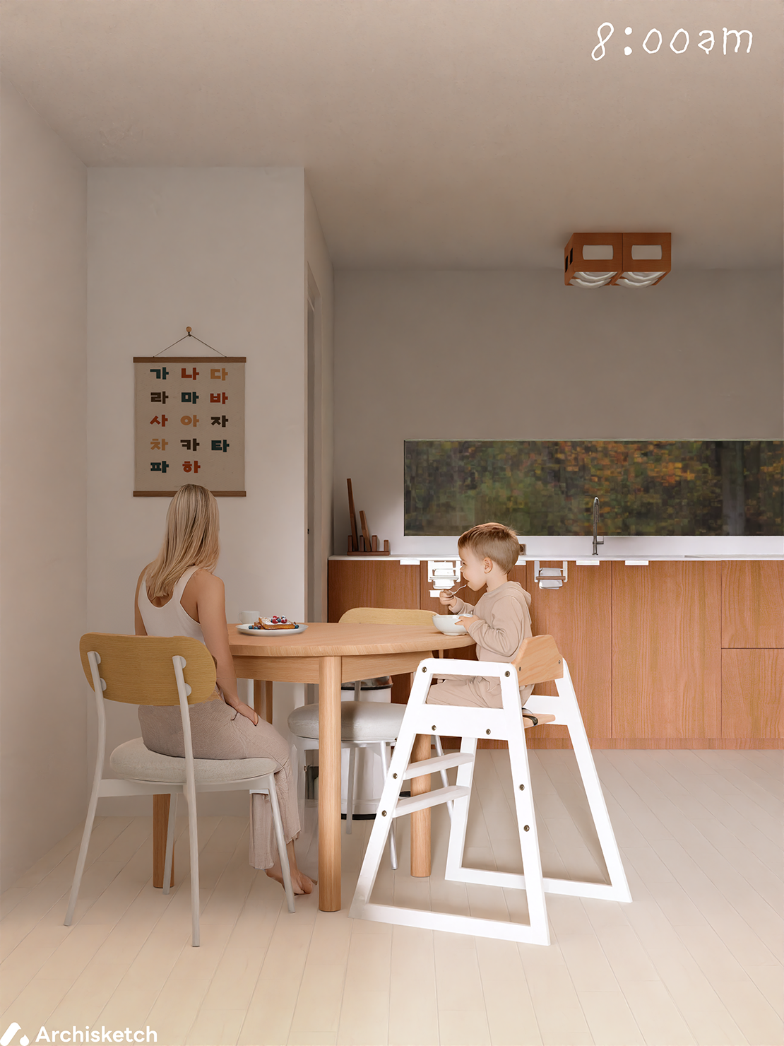 의뢰자 가족 분들은 꼭 아침 식사를 하세요. 아이가 있는 집은 보통 아침을 드시더라구요. 남편 분은 이른 출근길에 오르기 때문에, 도시락을 싸는 시간이 가족의 하루를 여는 첫 루틴이죠. 아이와 함께 앉는 아침 식탁은 까사미아의 로네 원형 테이블로 선택했어요. 모서리가 없어 다칠 걱정이 없고, 3인 가족에게는 딱 좋은 사이즈예요. 주방 쪽 인테리어는 최대한 원목으로 구성했어요. 캐비닛, 천장 조명, 테이블, 의자까지 모두 따뜻한 원목 톤으로 맞췄고, 그 덕분인지 편식이 심하던 아이도 식사 시간을 조금 더 편안하게 받아들인다고 해요!
