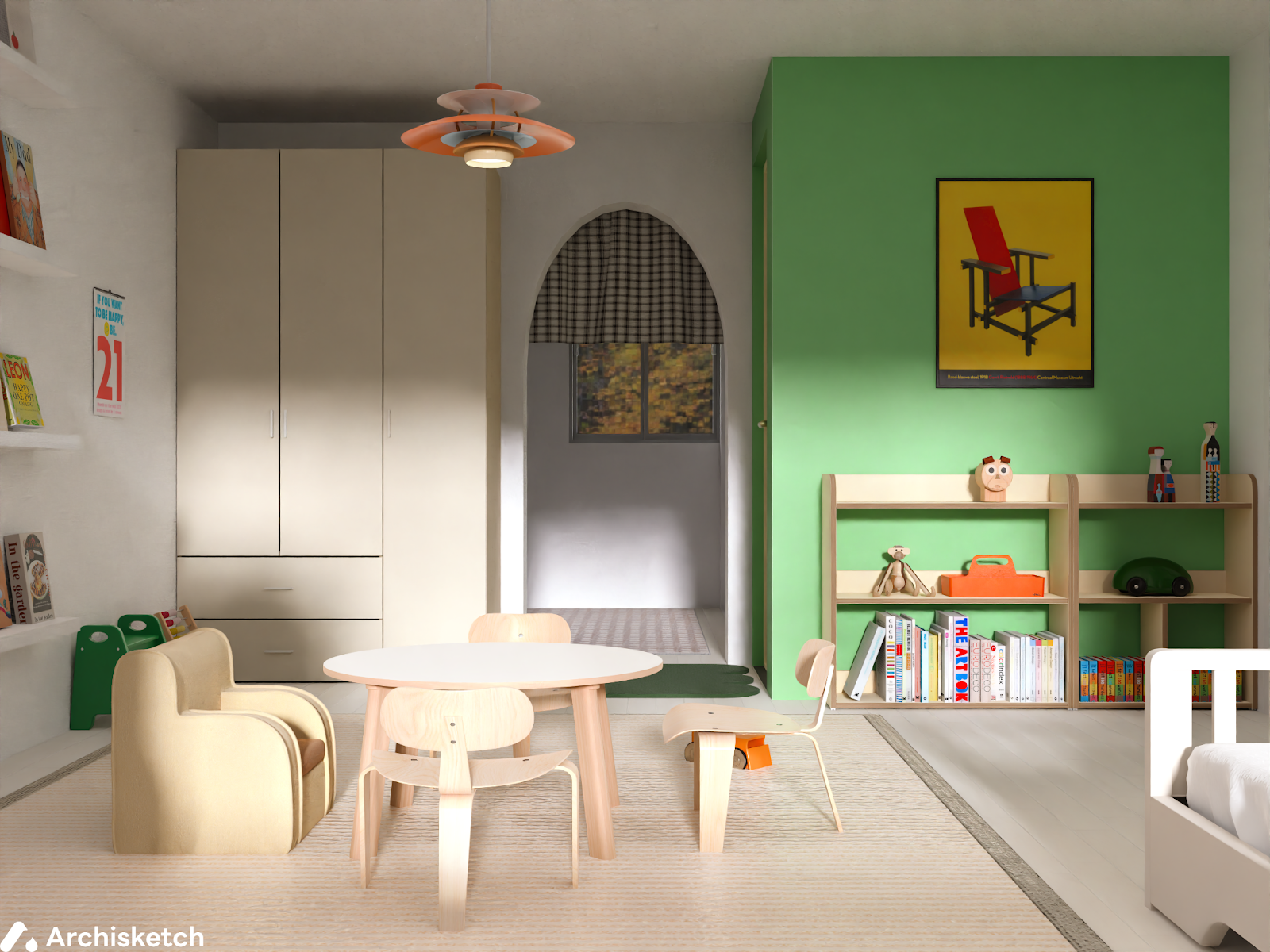 아치형 문을 설치해서 공간에 귀여움을 조금 더 넣었어요. 아치형 문 왼 편에 배치된 옷장도 공간과 매우 잘 어울리지 않나요? 까사미아의 뉴아빌 옷장을 설치해서 아이의 옷까지 전부 수납할 수 있도록 했어요. 밝은 우드 컬러를 유지하기 위해 내추럴 컬러를 선택했답니다