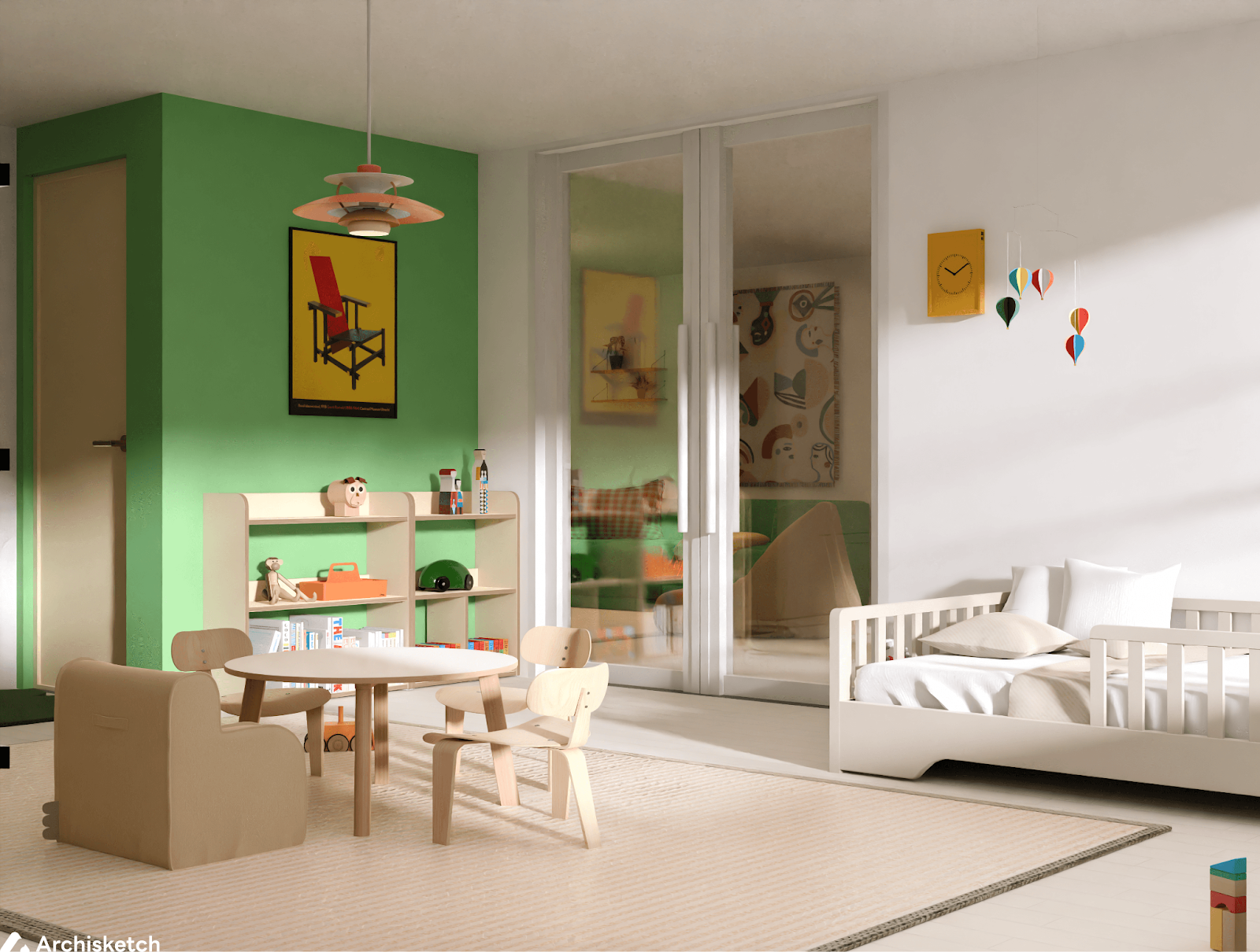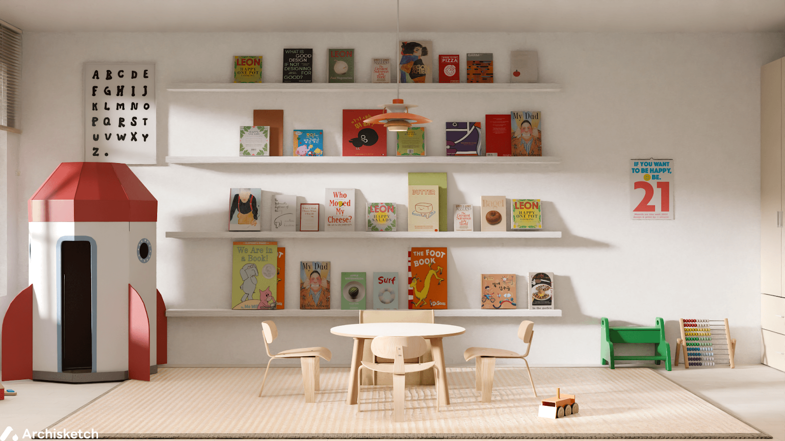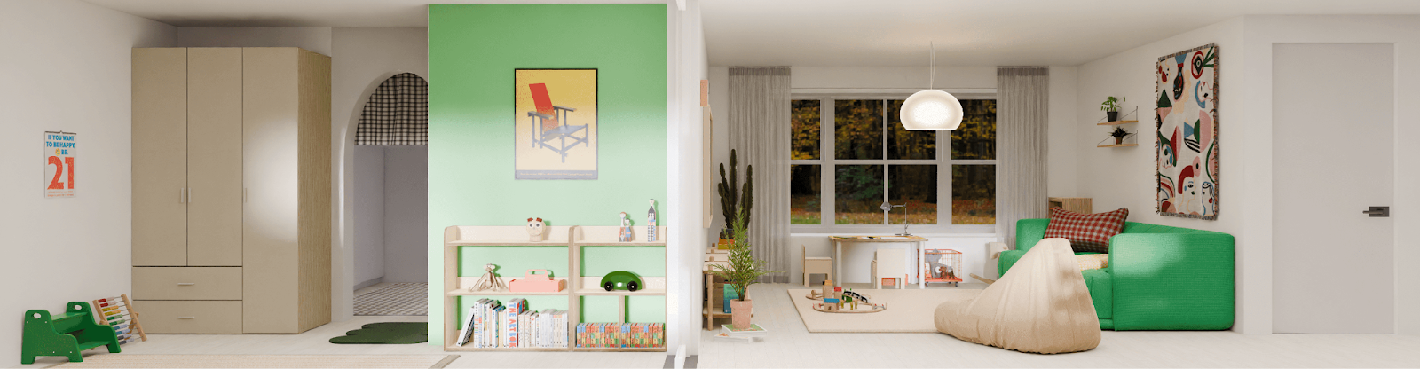 아이가 좋아하는 그린 컬러가 빛을 발하는 공간이에요. 시각을 자극하는 밝고 채도 높은 색감이 아이를 더욱 활기차게 만들어주는 것 같아요. 3살 아이에게는 한창 오감을 좋은 방향으로 자극해주는 게 성장에 좋거든요!