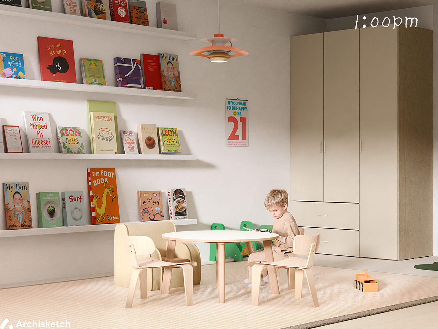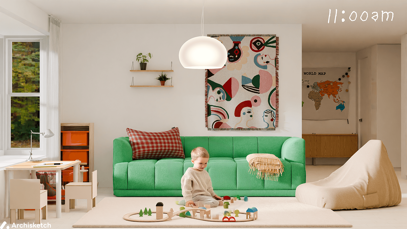 아침을 먹고 아이가 신나게 노는 시간이에요! 이 시간은 하루 중 아이가 가장 좋아하는 시간이기도 해요. 거실은 처음부터 아이의 시선에 맞춰 설계했어요. 무언가를 ‘두는 공간’이 아닌, 무언가를 ‘할 수 있는 공간’으로 만들고 싶었어요. 햇살이 가득 드는 창가엔 작은 책상을 두었어요. 그 자리에서는 창밖을 바라보며 무언갈 하길 원했어요. 책을 펼치고 색연필을 잡는데, 아이가 창밖을 바라보며 그림을 그리면 조금 더 재밌고 창의성 있는 그림이 완성된답니다. 소파 옆에는 일반 암체어 대신 부드러운 빈백을 놓았어요. 아이부터 어른까지 누구든 편하게 사용할 수 있는 자리예요. 자유롭고 제약 없는 쉼을 위해 꼭 넣고 싶었던 요소랍니다. 그리고 바닥엔 폭신한 대형 러그를 깔았어요. 아이의 놀이는 언제나 예측할 수 없기에, 넘어지더라도 아프지 않도록, 걱정 없이 마음껏 뛰놀 수 있도록요.