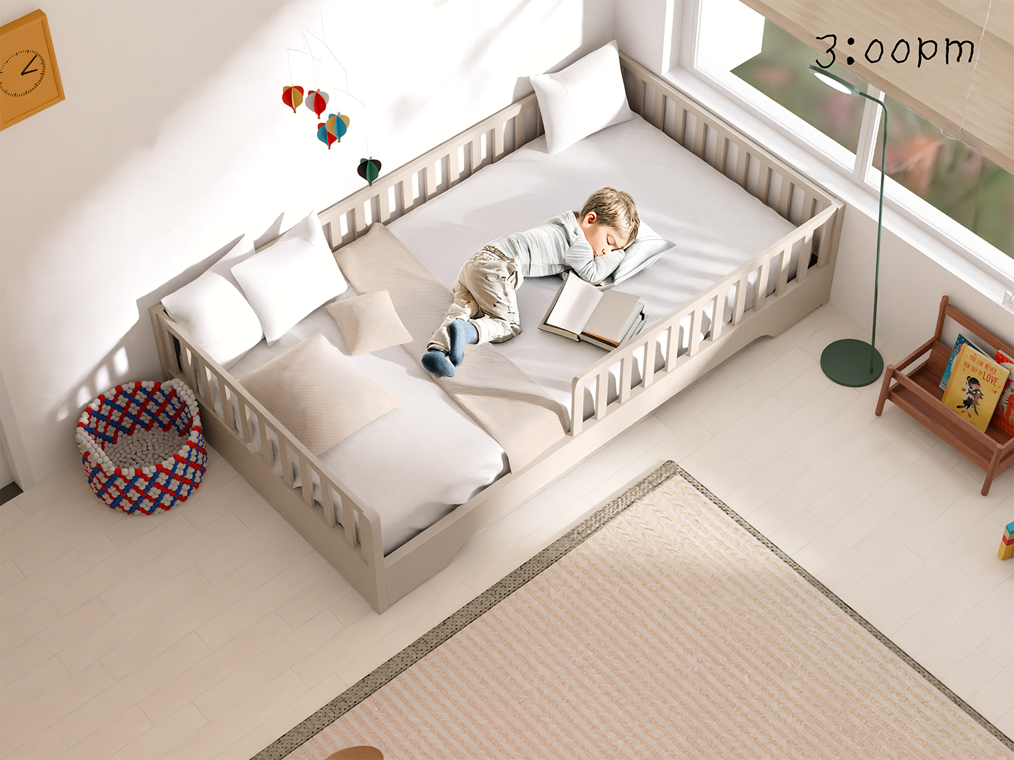 실컷 놀다가 지쳐 잠드는 시간이에요. 장난감을 품에 안은 채 그대로 잠드는 날도 많아요. 아직은 어둠이 무서운 시기라 침대는 햇살이 자연스럽게 드는 창가 쪽에 배치했어요. 무겁게 가린 어둠보다, 가벼운 빛이 오히려 아이에겐 더 편안하게 느껴지겠더라고요. 그래도 빛이 너무 강할 땐 부드러운 블라인드로 조절할 수 있도록 설치해두었어요. 빛과 그늘 사이를 조율할 수 있는 구조 덕분에, 아이도 낮잠을 훨씬 안정적으로 받아들이게 되었답니다. 이 시간은, 아이를 돌보는 어른들도 숨을 고를 수 있는 시간이랍니다.