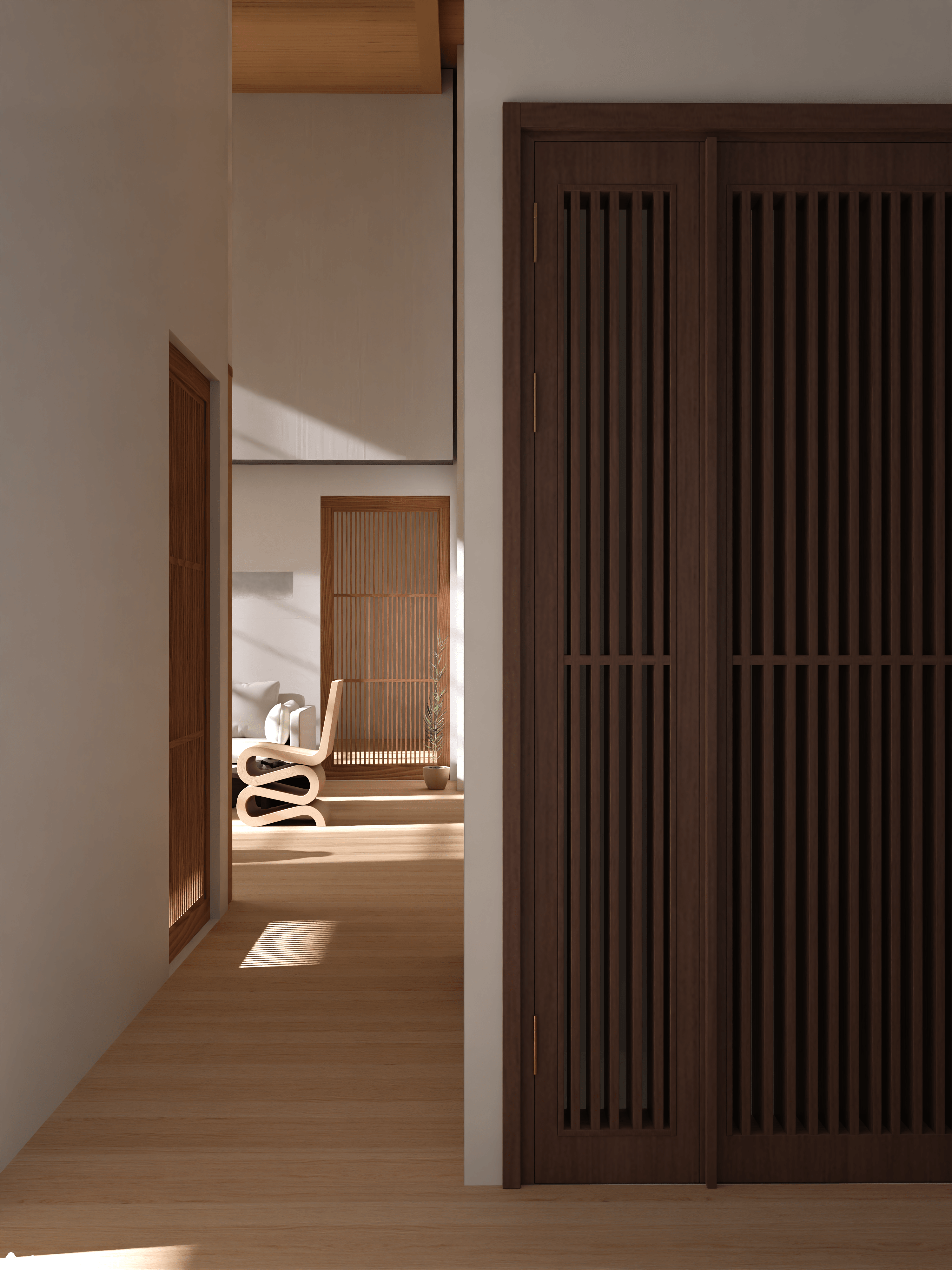 일본 스타일의 인테리어를 할 때 활용하면 좋을 조형은, 직선과 격자 그리고 빗살이에요. 간결한 선을 사랑하는 일본의 취향이 공간에 고스란히 스며들어야 하죠. 그래서 공간에 격자의 오브제 선반과 창틀을 설치했어요.